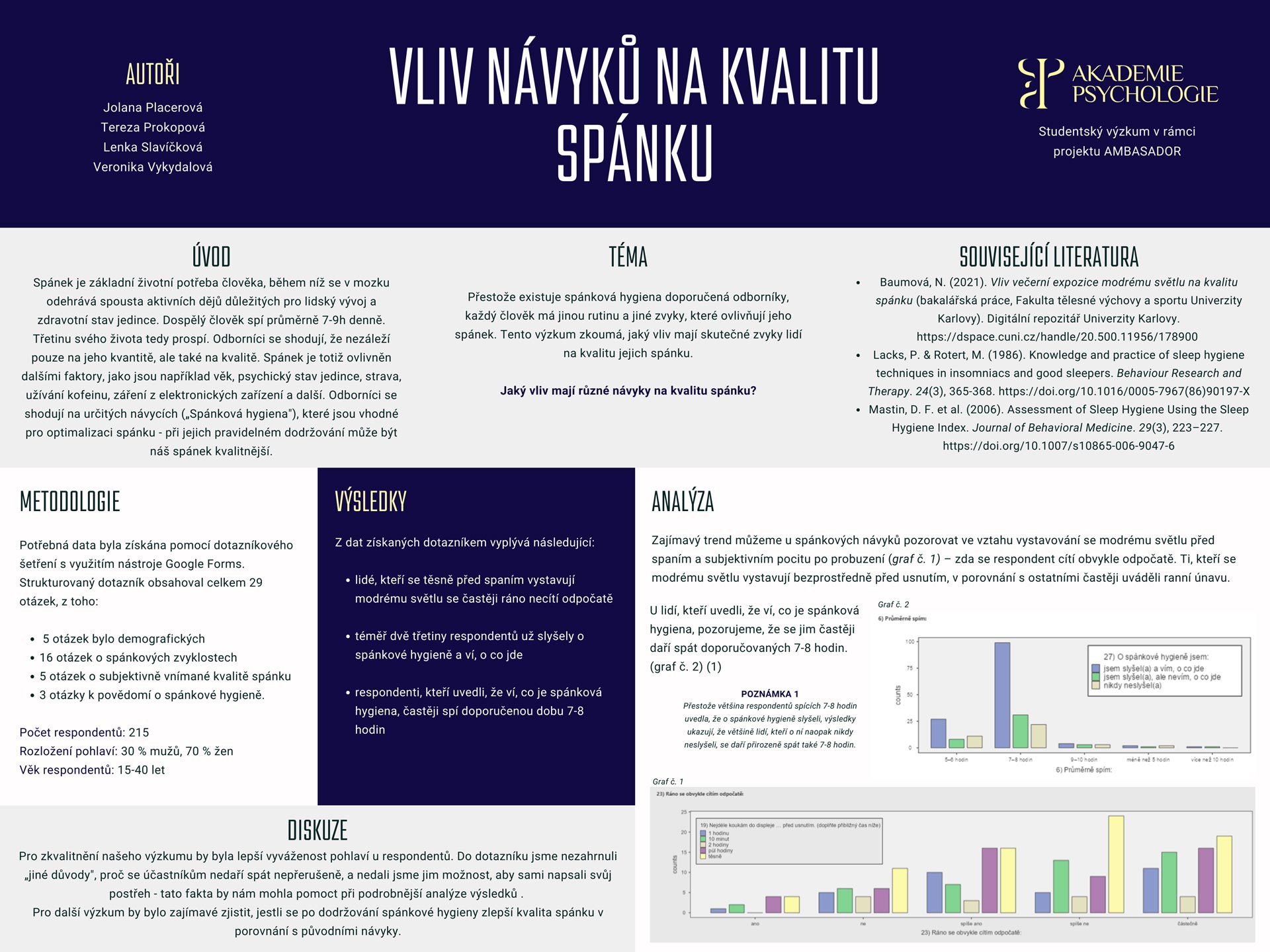 „Díky Ambasadoru jsem získala náhled do vědecké psychologie. Mimo základy statistiky jsme se dozvěděli, jak postupovat při výzkumu, který jsme si vyzkoušeli na vlastní kůži a předvedli jej ve výsledném posteru. Mimo to jsme se dozvěděli, kde čerpat, jak ověřovat informace, podívali jsme se online do prostředí, kde experimenty probíhají. A skvělé byly také příběhy z experimentálního prostředí. I přes to, že tímto směrem bych nechtěla jít, mě to opravdu nadchlo a přineslo spoustu užitečných znalostí.“